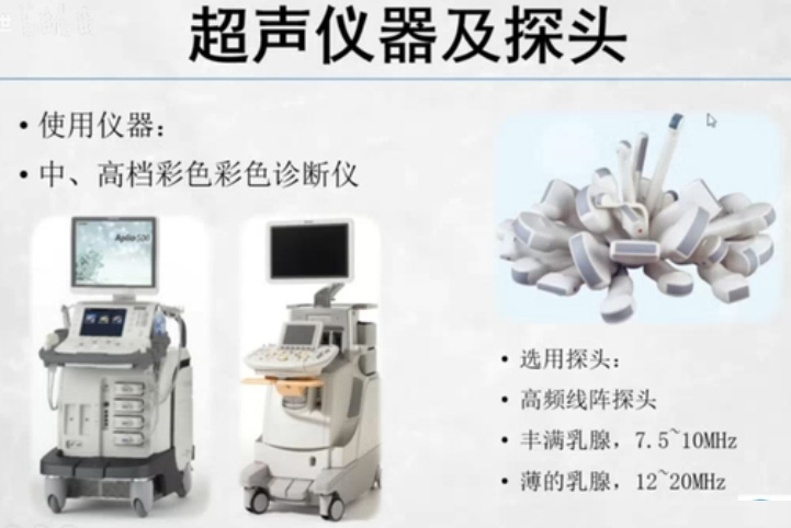 那么使用的设备呢要求是中高档的彩色诊断仪。探头型号非常的丰富,针对不同的器官采用不同的探头。检查乳腺使用高频线阵探头,穿透力分辨率,丰满乳腺,采用7.5~10MHz探头,薄的乳腺乳腺小的患者,采用12~20MHz探头。乳腺的扫查方法有两种,看个人的习惯,一是从上到下,左到右,移动探头逐一切面扫描探头不要跳跃。采用联网式,二是顺时针或者逆时针方向,由乳头为中心辐射状扫描检查。乳头向外扫查,乳头向内扫查都可以。最重要的也是探头不要跳跃,一定要采用联网式的检查。采用哪种方法,按照习惯选择。乳腺的扫查的范围有外向内向外线内线,乳头中央区、向外延伸的腋尾区、腋窝、淋巴结四个象限。叠瓦式,剪草机式不放过任何位置。正常乳腺超声标准断面,经乳腺腺体最厚处、通常于外上象限取得,在此段面测量乳腺厚度。